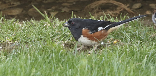 What did my wandering eyes see from across the yard wile I was gardening??? - an Eastern Towhee - yard bird #47 - coming out from under the deck! Who knows how long it's been visiting as that not a view I normally see.